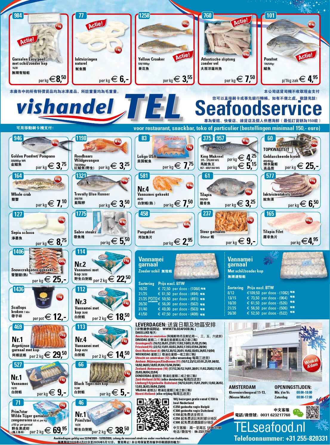 Leverdagen: 送貨日期及地區安排(详情请参阅网站:www.telseafood.nl )